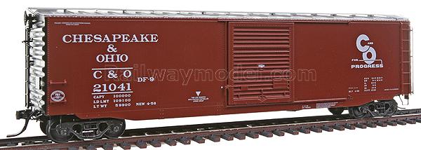 Полностью собранный 50' товарный вагон выпуска 1956 года тип PS-1 с 9' дверью Янгстауна. Принадлежность Chesapeake и Ohio #21041. Вагон с великолепной деталировкой, вплоть до установленных отдельных пружинках в тележках, тормозных шлангов и т.п.
