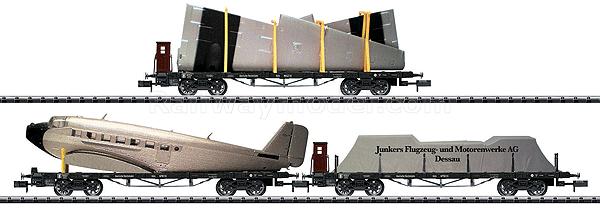 Серия Minitrix. Koln Flatcar, упаковка 3 шт, w/Ju 52/3m Aircraft Load. Принадлежность German State Railroad DR (Эпоха II)